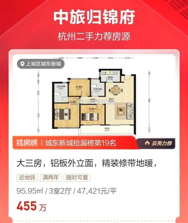 改善板块城东新城,中旅归锦府,2020年单价4.7万,流摇,同时期的萧山世纪城的君品,嘉品,澄品却是摇号红盘,也是单价4.7万!96方的小户型,让购房者预算从600多万降低到400多万,得房率比较高,6.7米宽的跑道阳台。胜利实验学区房,九年一贯制,4号线明石路地铁口约250米。