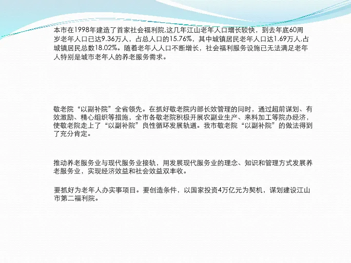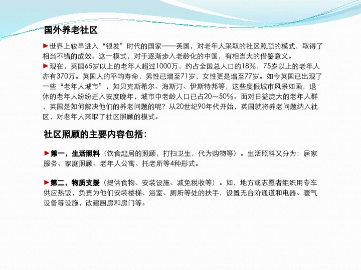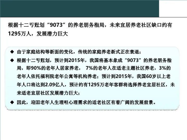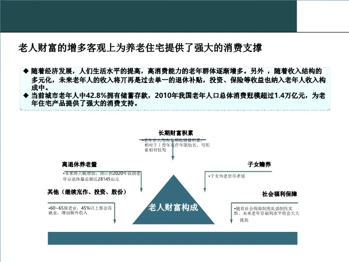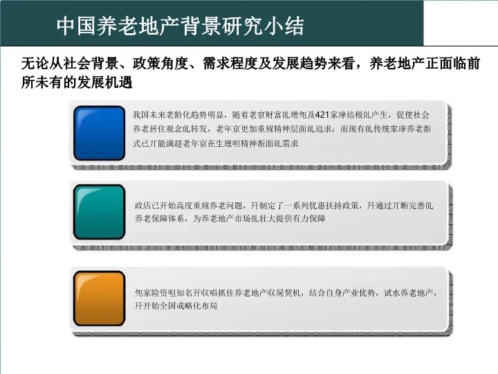 本报告是一份关于城市养老地产项目的综合性规划方案。报告首先深入分析了中国老龄化社会的现状与趋势,揭示了养老产业的巨大市场潜力和政策机遇。在此基础上,报告借鉴了国内外先进的养老理念与案例,如美国的太阳城和瑞士的养老院模式,提出了“持续照料,优雅生活”的核心服务理念。方案的核心部分是对项目规划设计体系的详细建议,涵盖了园区规划、建筑细节、适老化设计、智能化配置及丰富的配套设施,旨在打造一个集养老、康复、休闲、娱乐于一体的综合性老年社区,实现“老有所养、老有所医、老有所学、老有所为、老有所乐”的目标。