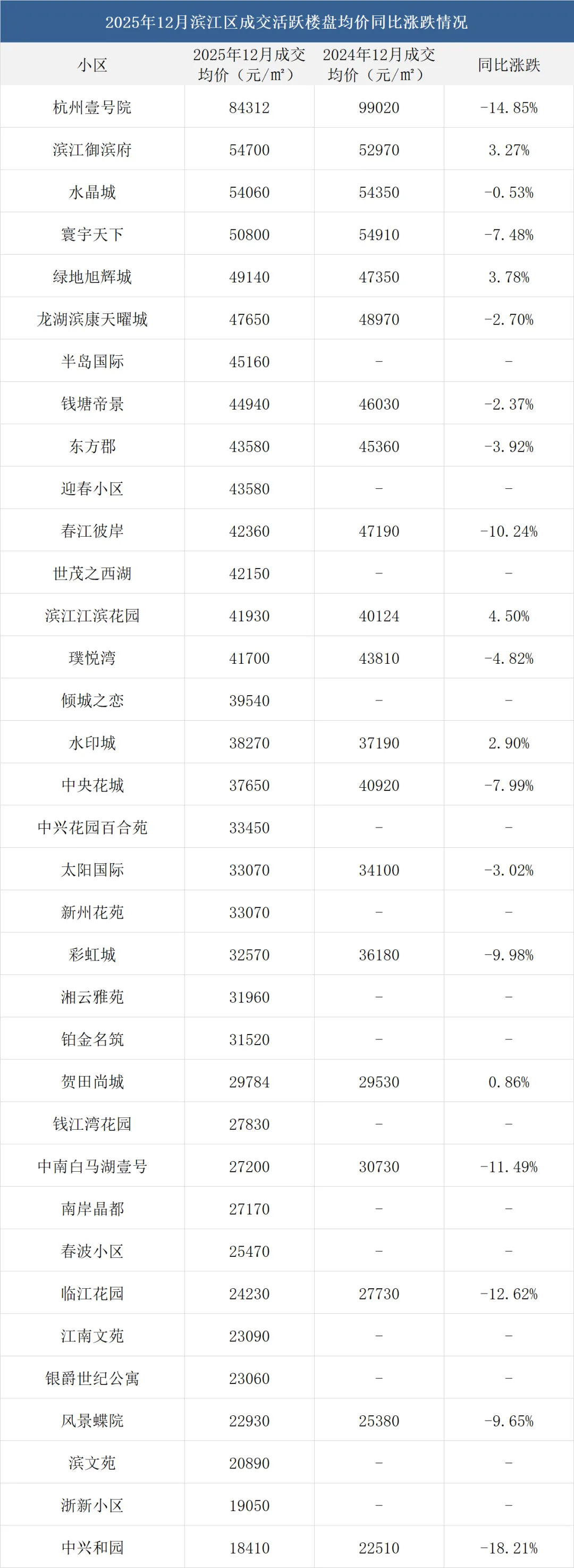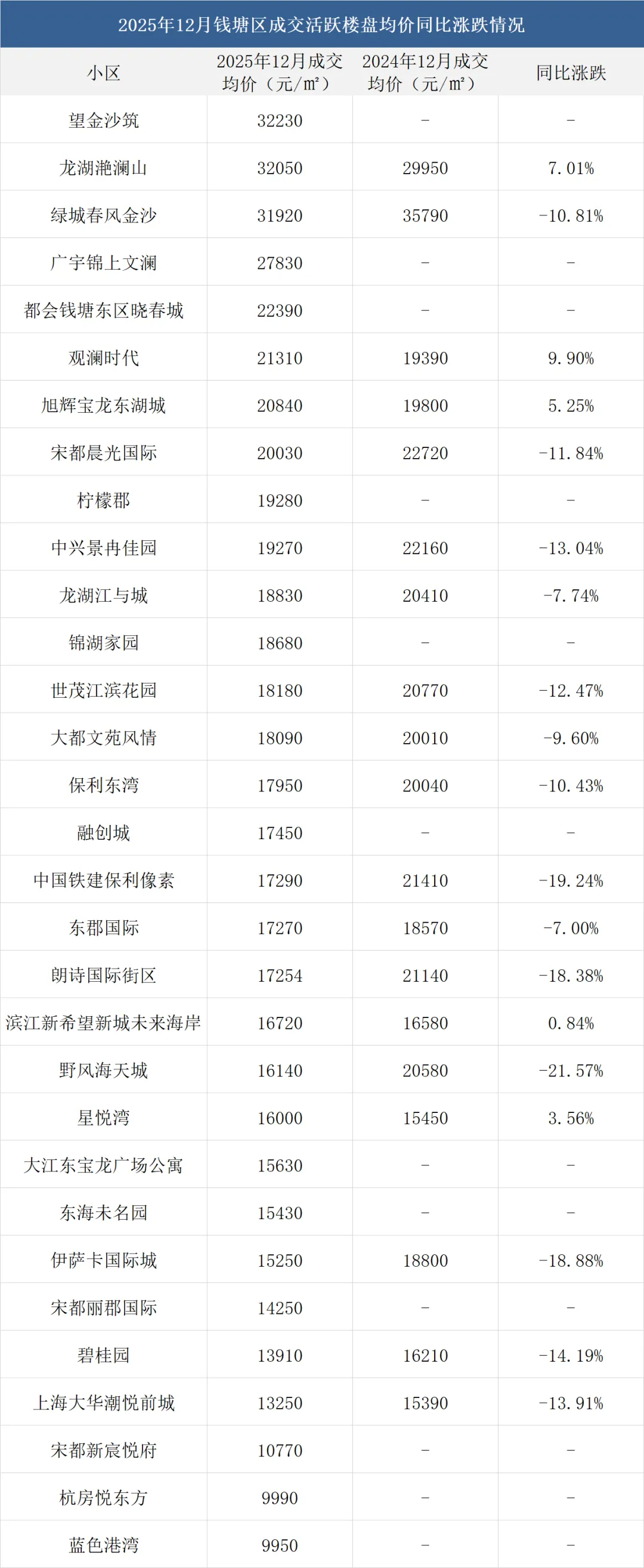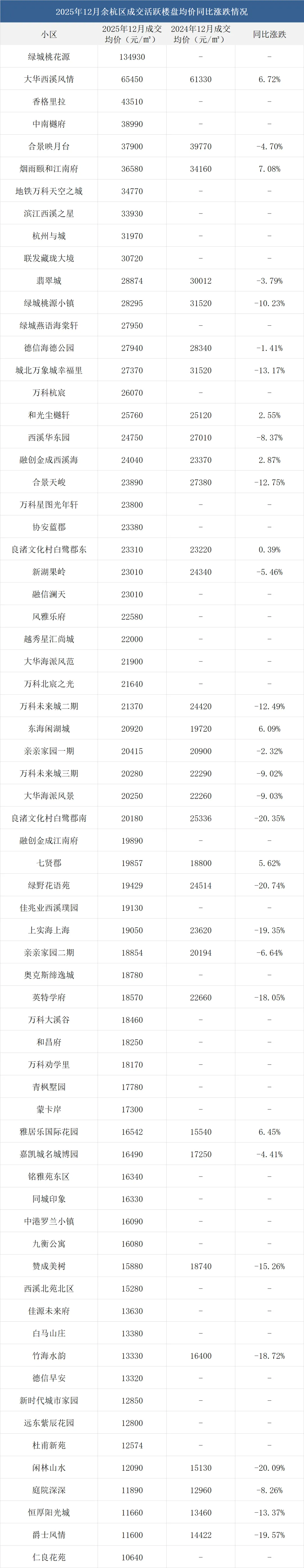 注:一、以上数据来源于中指研究院,统计为2025年12月二手房成交均价,2024年12月二手房成交均价;二、在不同成交时期,成交的物业类型(别墅、排屋、公寓等)、精装与否、户型大小、楼层与楼幢位置的不同会造成价格变动;三、有些房源为了减少税费,会稍微压低成交单价;而有些二手房为了增加银行贷款,也有可能稍微做高单价,具体房源信息建议去实地看看。
