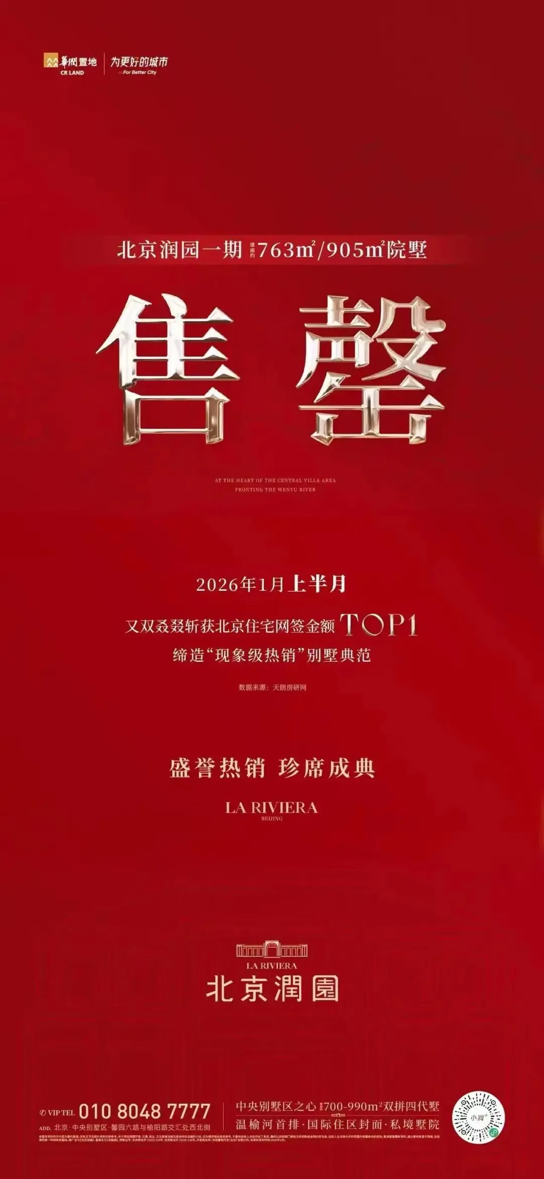 北京润园在2025年12月开盘后,便迅速登顶北京住宅成交金额与面积双料榜首,更一举包揽北京别墅市场面积、套数、金额三冠王,用实打实的业绩,打破市场观望情绪。