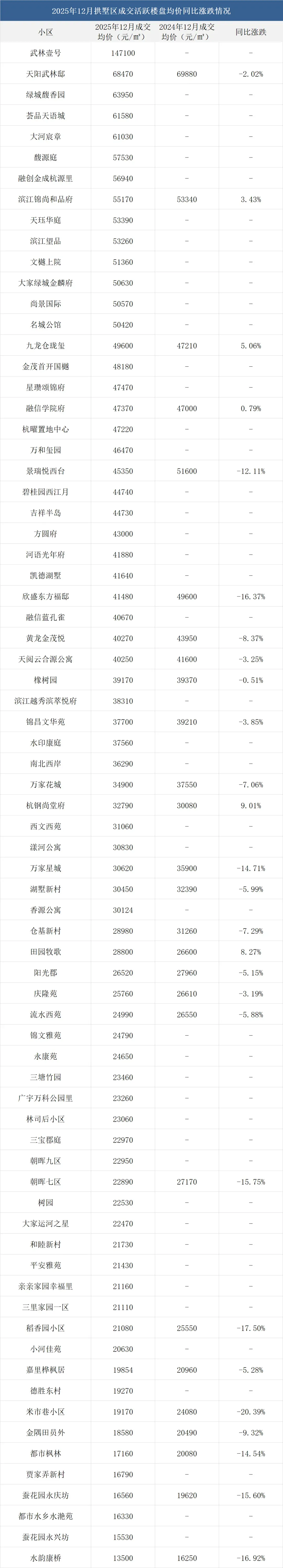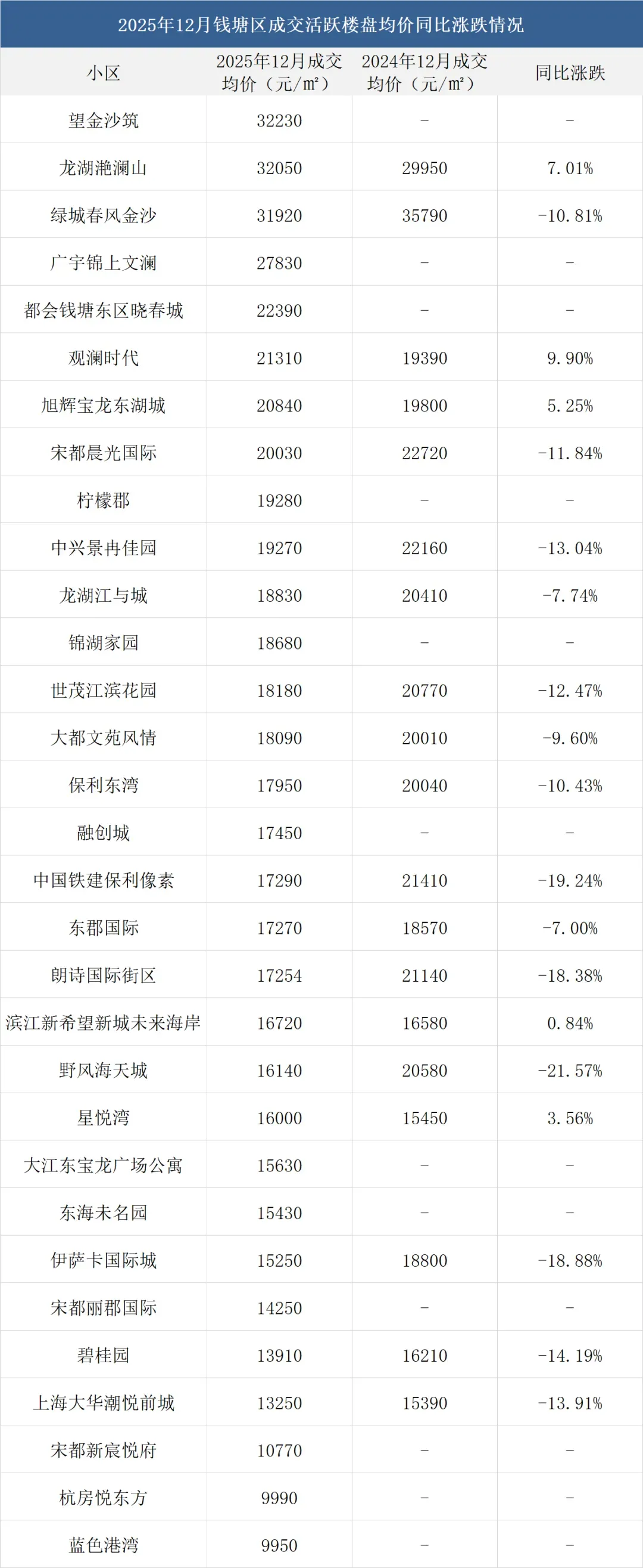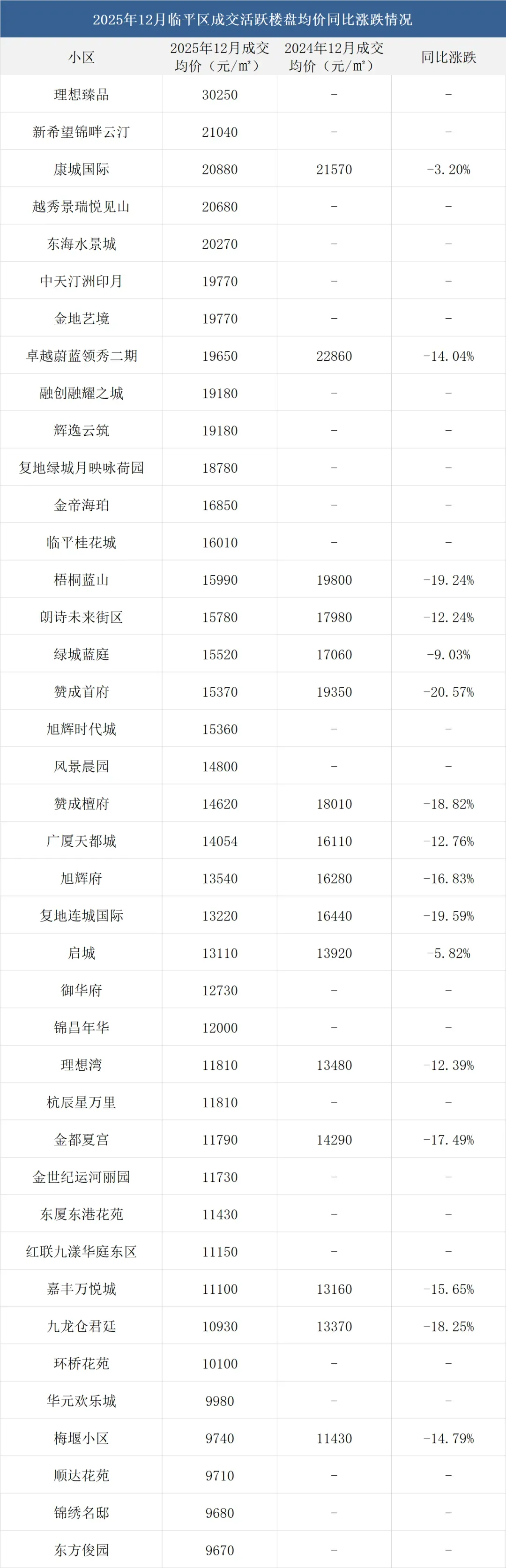 注:一、以上数据来源于中指研究院,统计为2025年12月二手房成交均价,2024年12月二手房成交均价;二、在不同成交时期,成交的物业类型(别墅、排屋、公寓等)、精装与否、户型大小、楼层与楼幢位置的不同会造成价格变动;三、有些房源为了减少税费,会稍微压低成交单价;而有些二手房为了增加银行贷款,也有可能稍微做高单价,具体房源信息建议去实地看看。