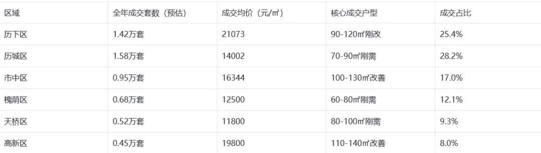 注:成交数据基于济南房协全年汇总及区域占比测算,均价来源于贝壳网全年成交均价,不含工抵房、法拍房等特殊房源。