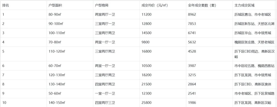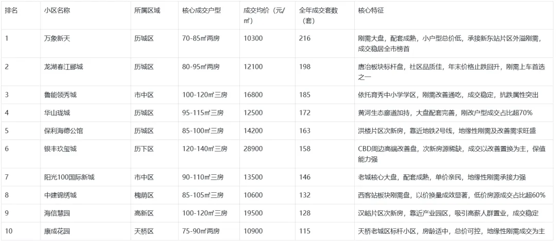 结合济南房协备案数据及贝壳全年成交统计,成交量前十小区多集中在历城、历下核心板块,刚需小户型成交活跃,核心区改善次新房凭借稀缺性稳居前列,议价空间普遍低于市场平均水平。