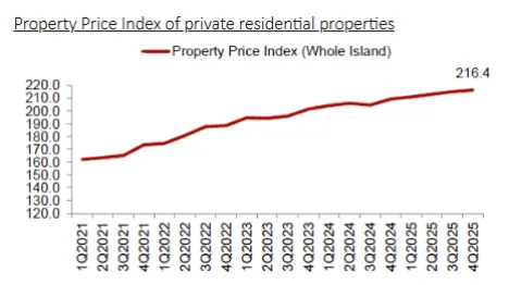新加坡城市发展局每个季度都会发布一系列的新加坡房产数据。这是新加坡最权威的房产数据来源。以下就是2025年第四季度,也是最新的一个季度的数据: