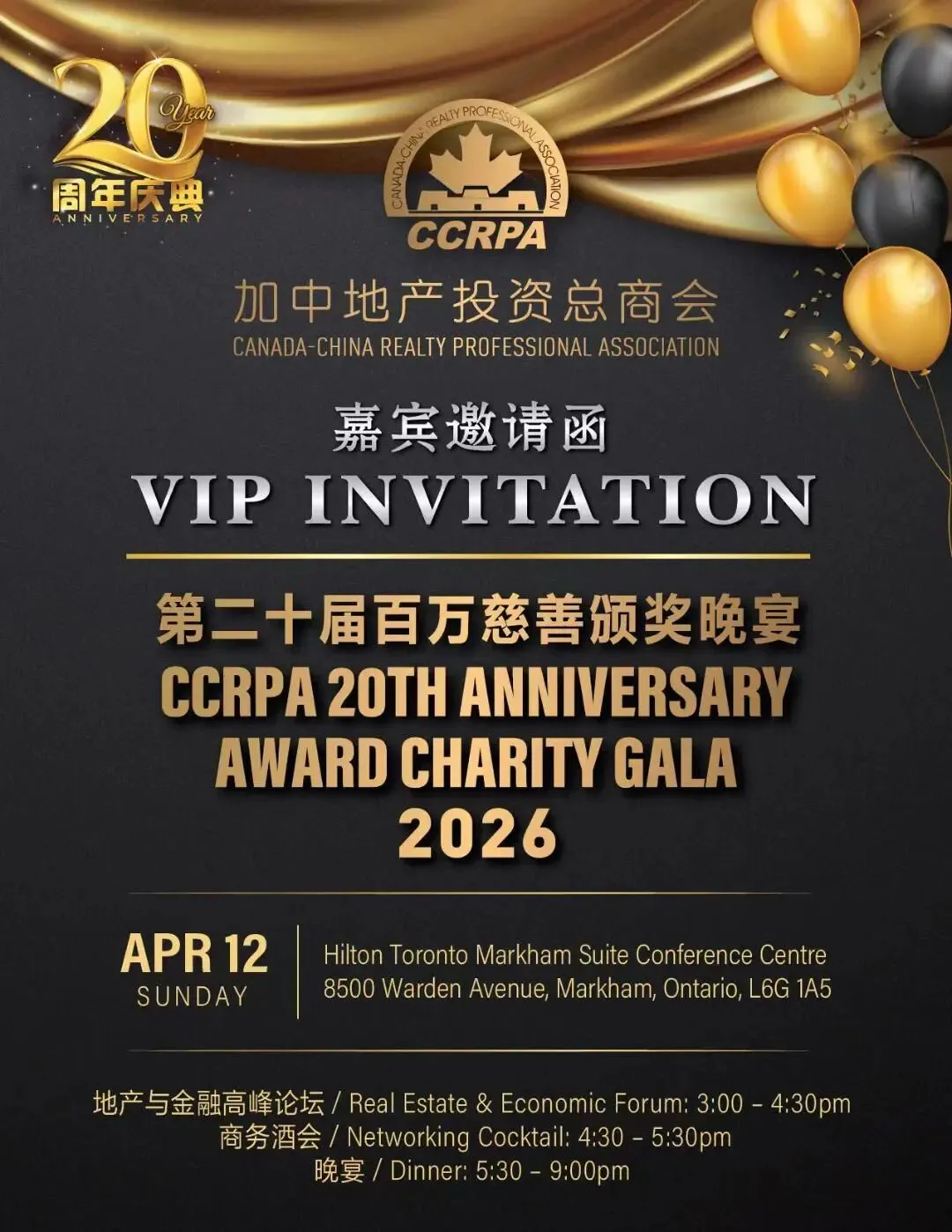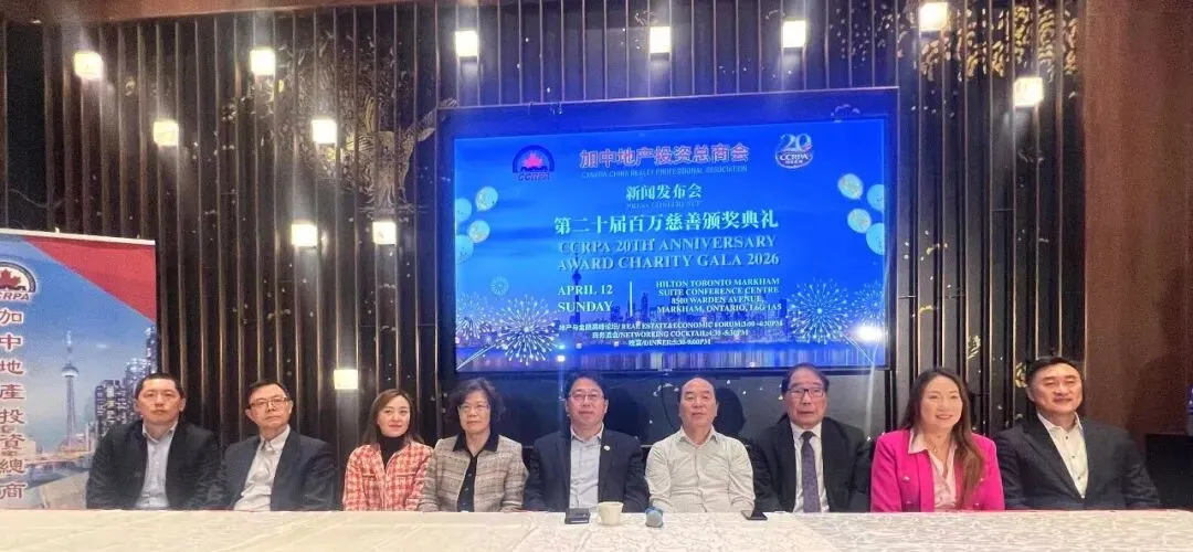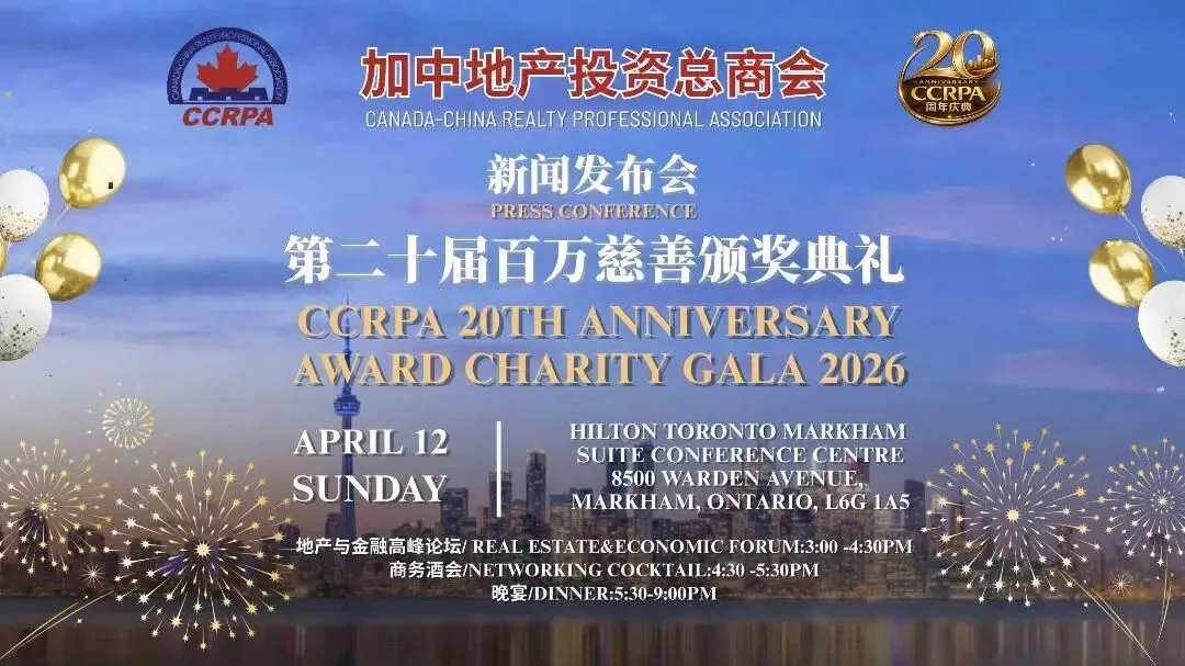 2026年,恰逢加中地产投资总商会CCRPA成立二十周年。为庆祝地产总商会CCRPA二十年来为加拿大社会及地产行业作出的卓越贡献,同时进一步履行CCRPA对慈善事业累计一百万加元捐赠的庄严承诺,会长孙志峰Steven Sun正式宣布:2026年4月12日(星期日),加中地产投资总商会CCRPA将在万锦市希尔顿会议中心Hilton Toronto Markham Suite Conference Centre隆重举办由中国茅台冠名赞助支持的「CCRPA第二十届百万慈善颁奖典礼晚宴」,本届活动将汇聚来自大多伦多地区数百家地产及相关企业,近千名地产精英、商界嘉宾及行业领袖齐聚一堂,鼓舞士气,奖励先进,同时履行社会责任与担当,为老人社区筹集百万善款,以实际行动回馈社会。