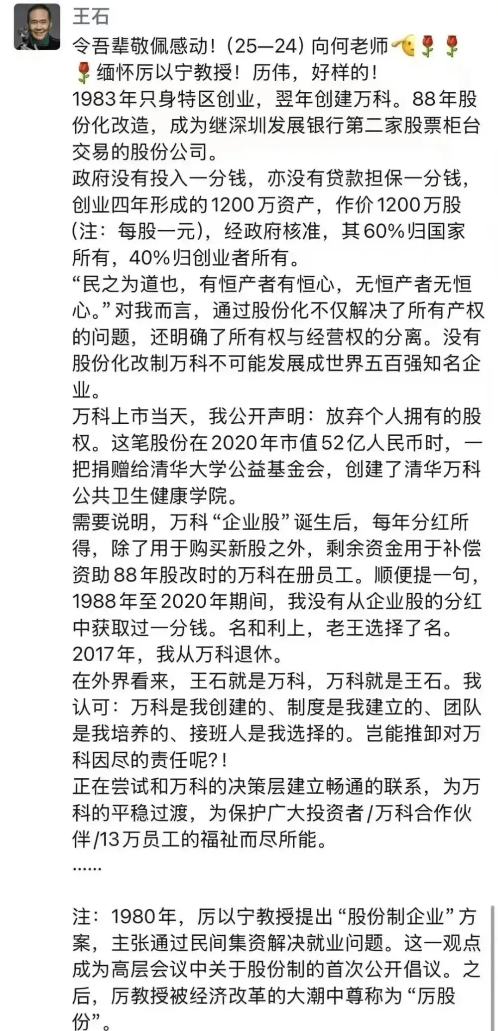 2024年危机公开后不久,王石在微信朋友圈发了一条耐人寻味的状态。