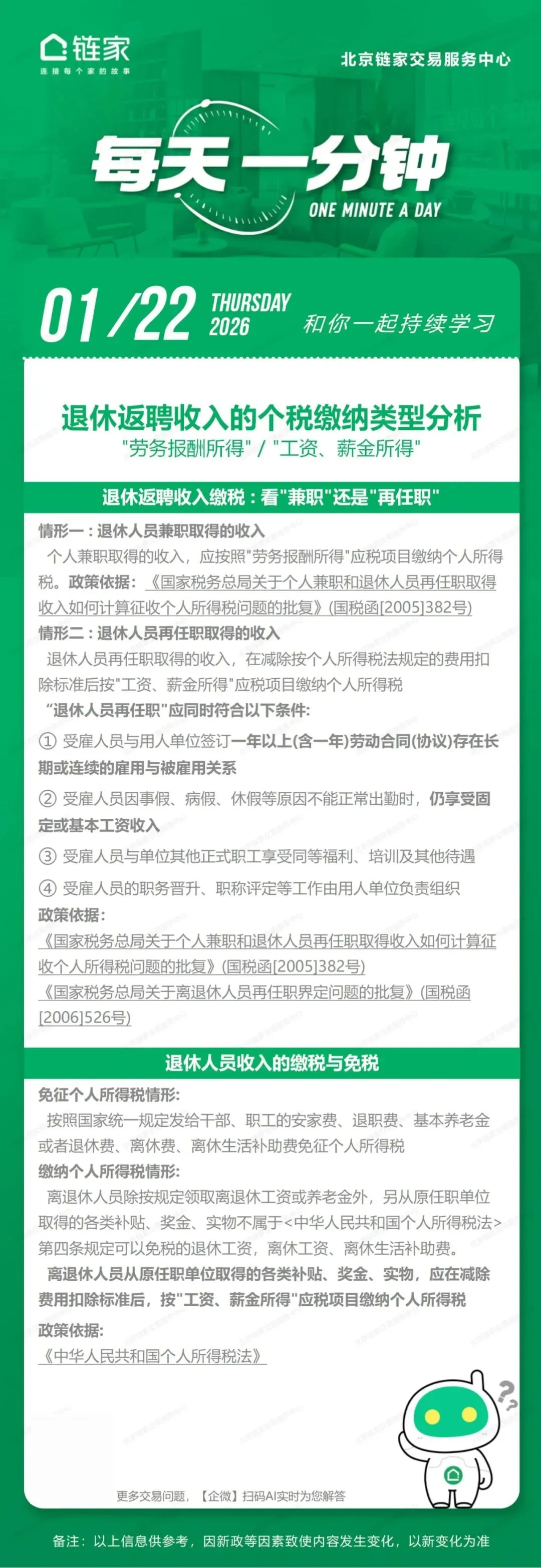 在关注房产市场的同时,我们的生活中还有很多与我们切身利益相关的知识需要了解,比如退休返聘人员的个税缴纳问题。最近,北京链家交易服务中心就为我们带来了关于退休返聘收入个税缴纳的详细分析。(一)“兼职”还是“再任职”:个税缴纳大不同