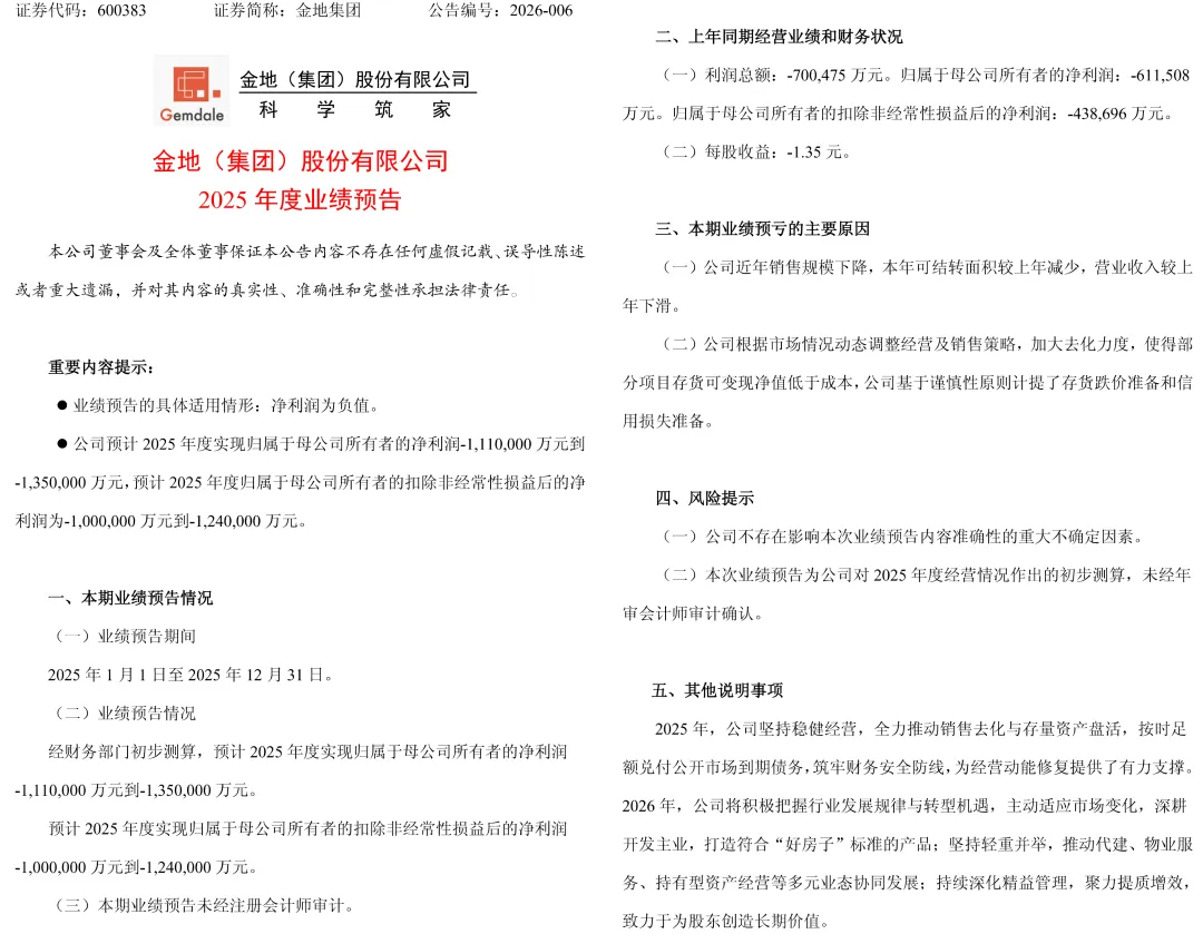 2026年1月23日晚间,金地集团发布一则预告:预计2025年度归母净利润亏损高达111亿元至135亿元,扣除非经常性损益后亏损也达100亿元至124亿元。与上年同期亏损约61亿元相比,亏损额近乎翻倍,房地产行业(或者至少说是金地集团)的寒冬仍然未到底!。