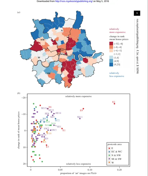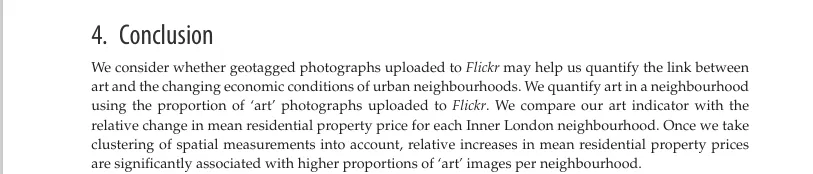 伦敦内城街区中,"艺术"照片比例更高的街区,房价相对涨幅也更大。这种关联在统计上是显著的。