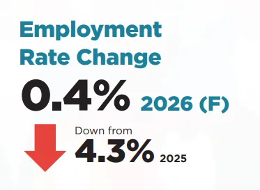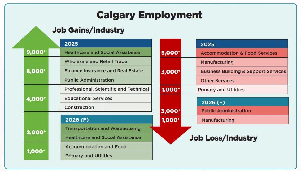 2025年,卡尔加里的就业增长超出预期,全年平均增长约 4%。尽管部分行业出现明显裁员,但裁员主要集中在:住宿与餐饮服务业、制造业、商业及其他服务业。 与此同时,就业增长主要来自:医疗与社会援助行业