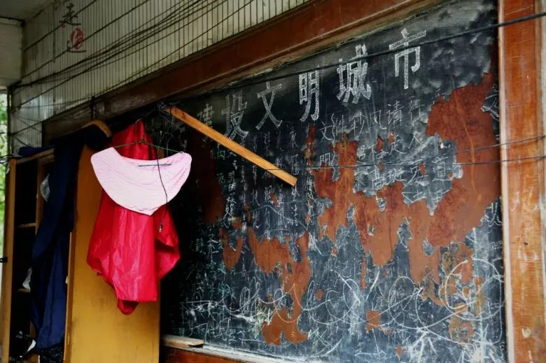 黑板墙已经斑驳不堪,被爬山虎的触角密布的教学楼已经看不出原貌,只有生锈的指示牌才能让人恍然明白这里原来曾有过书声琅琅。