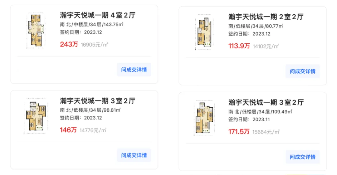 瀚宇天悦城一期,开盘16600元/㎡,近期成交均价16000元/㎡左右。