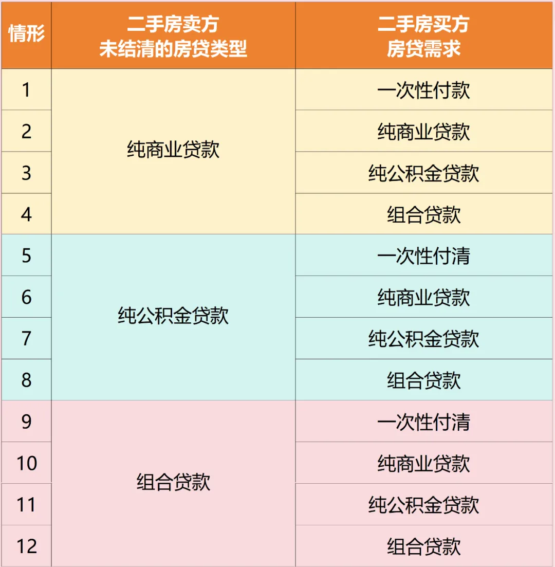 二手房“带押过户”细分了看,根据卖方未结清的房贷类型,以及买方是否需要办房贷、要的话办的是什么类型的房贷,具体涉及下表所列的12种情形: