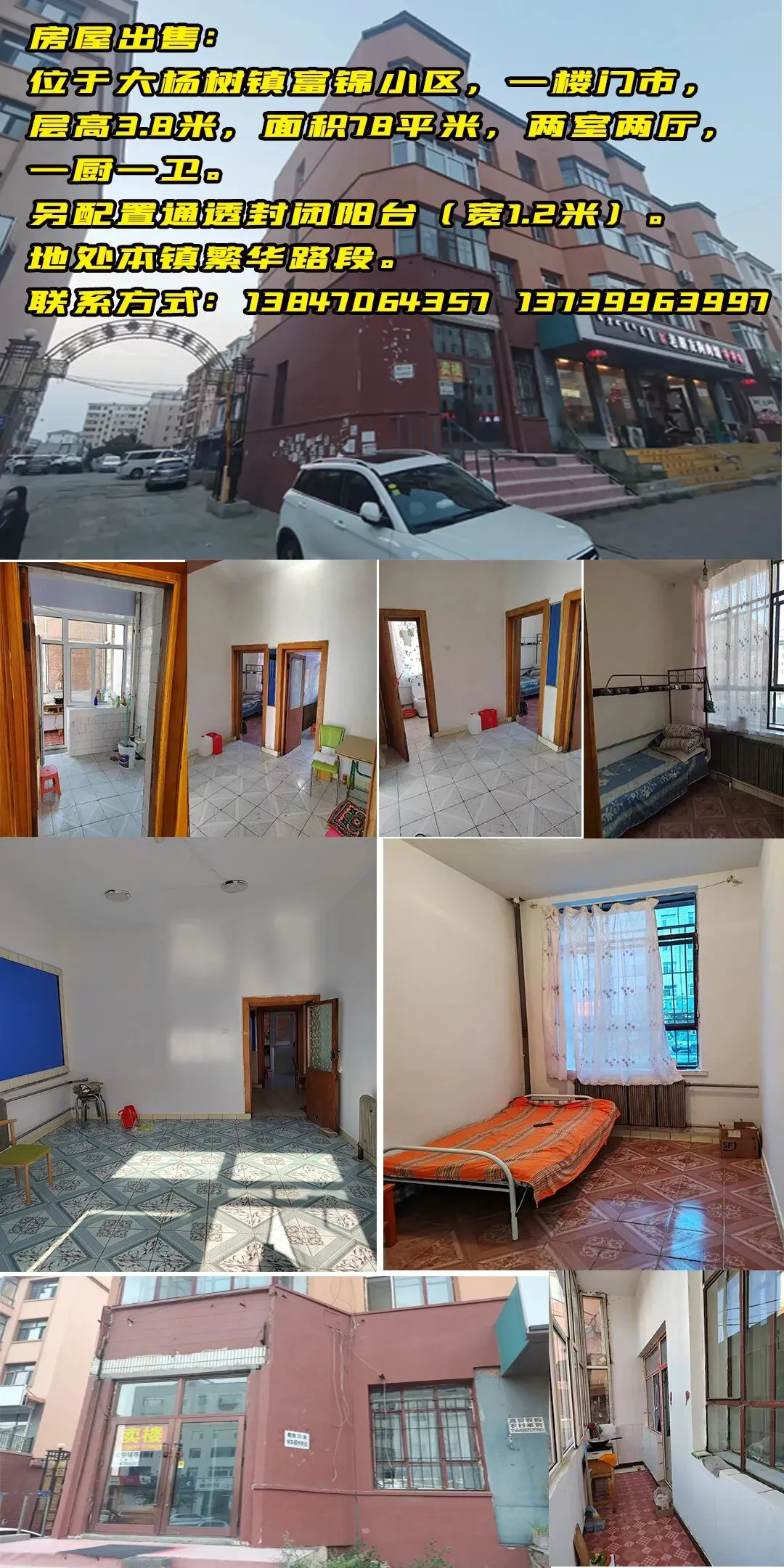 位于大杨树镇富锦小区,一楼门市,层高3.8米,面积78平米,两室两厅,一厨一卫。另配置通透封闭阳台(宽1.2米)。地处本镇繁华路段。