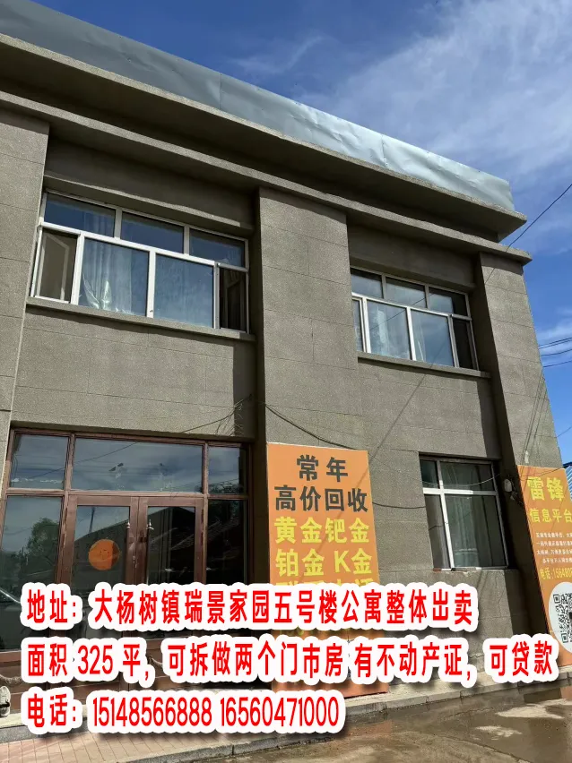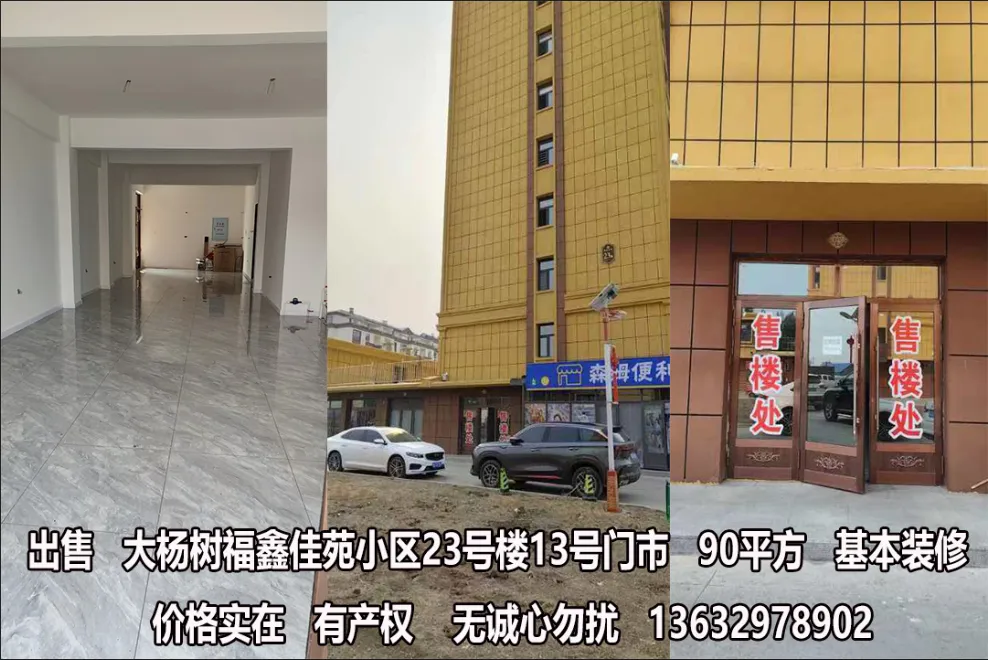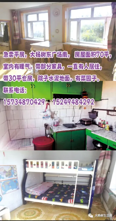 出卖杨树东三角区处5000平院,有150平住宅,260平风雨棚,三项电!!可供收购、养殖、存煤、收废品等。非诚勿扰!电话15147084888。卖平房大院,占地约3000平方米地址,大杨树镇北山加油站附近,价格面议,非诚勿扰,联系电话,13948809996出售杨树东新区31号1单元501,3室1厅,精装修拎包入住,联系电话13848702777卖楼,林业局拐坝楼一带二,总面积180平,一楼超市有稳定客源,二楼住宅宽敞明亮,老人岁数大了,无能力帮我,有意者联系我18347079038大杨树方舟名苑门市房低价出售,挥泪赔钱大甩卖,带传菜电梯,中央空调,只要诚信买,带价你就来。原价6880元一平米,340平。有实力的联系我吧,价格随便研究18747008899出售金地家园高层10楼,102平,带全部家具家电,拎包入住,联系电话 15561668006出售金地家园高层10楼,102平,带全部家具家电,拎包入住,联系电话 15561668006