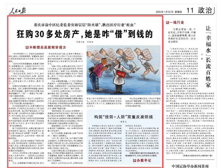 1月22日,《人民日报》刊登《重庆市渝中区纪委监委突破层层“防火墙”,揪出医疗行业“蛀虫” 狂购30多处房产,她是咋“借”到钱的》一文。