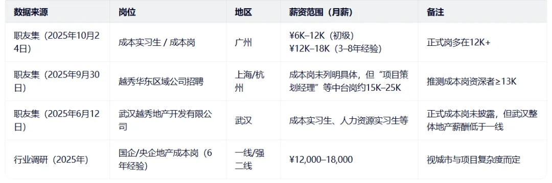 该员工离职前平均月薪1.3万元,推算出年基本工资15.6万元,无年终奖,年现金总收入≈15.6万元。根据上表,其薪资处于越秀地产土建成本岗的正常区间(广州地区6年经验成本岗普遍12K–16K)。对于2019年加入、全程参与多个开发项目成本管控的员工而言,该水平完全符合越秀地产内部薪酬体系的标准,虽略偏保守(若在文冲、琶洲等核心项目组,月薪可能达15K+),但整体属于合理范畴。