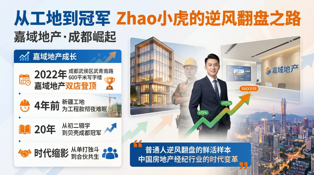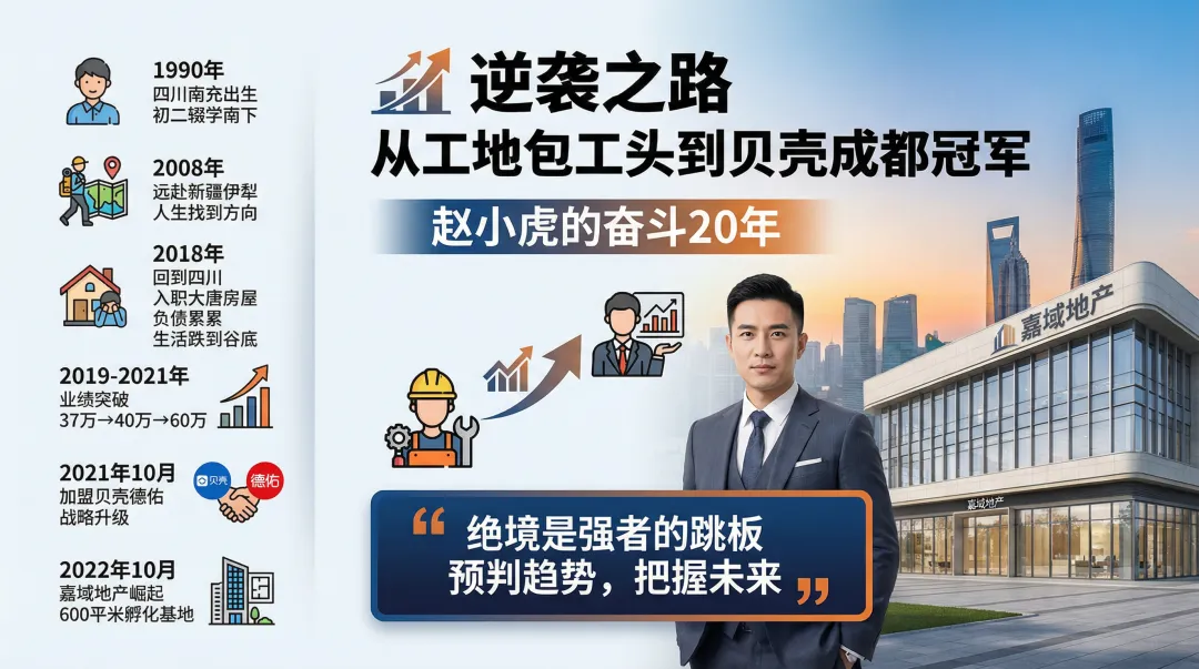 从初二辍学到南下进厂,从装修学徒到包工头,再到贝壳成都业绩冠军,赵小虎的二十年奋斗路,是普通人逆风翻盘的鲜活样本,更是中国房地产经纪行业从 “单打独斗” 到 “合伙共生” 的时代缩影。而嘉域地产,正是这场变革中,扎根成都、以创新合伙制闯出一片天的行业新势力。