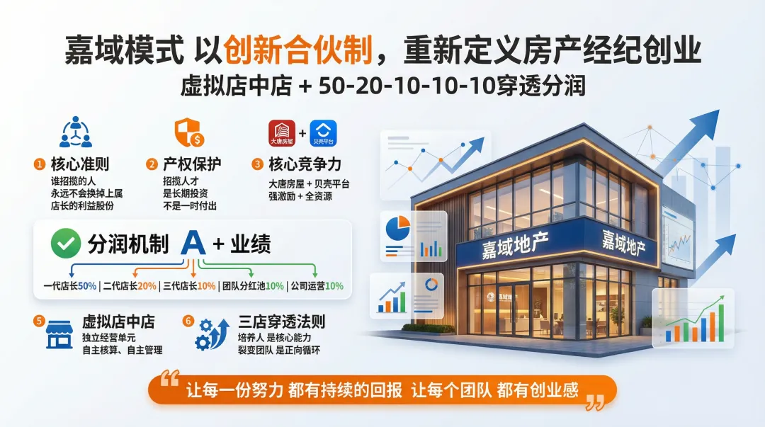 嘉域地产的核心竞争力,在于融合了大唐房屋的强激励分润机制与贝壳平台的全资源优势,独创了 **“虚拟店中店 + 50-20-10-10-10 穿透分润” 模式 **,让分润透明、利益共享、多劳多得成为刻在公司基因里的原则。