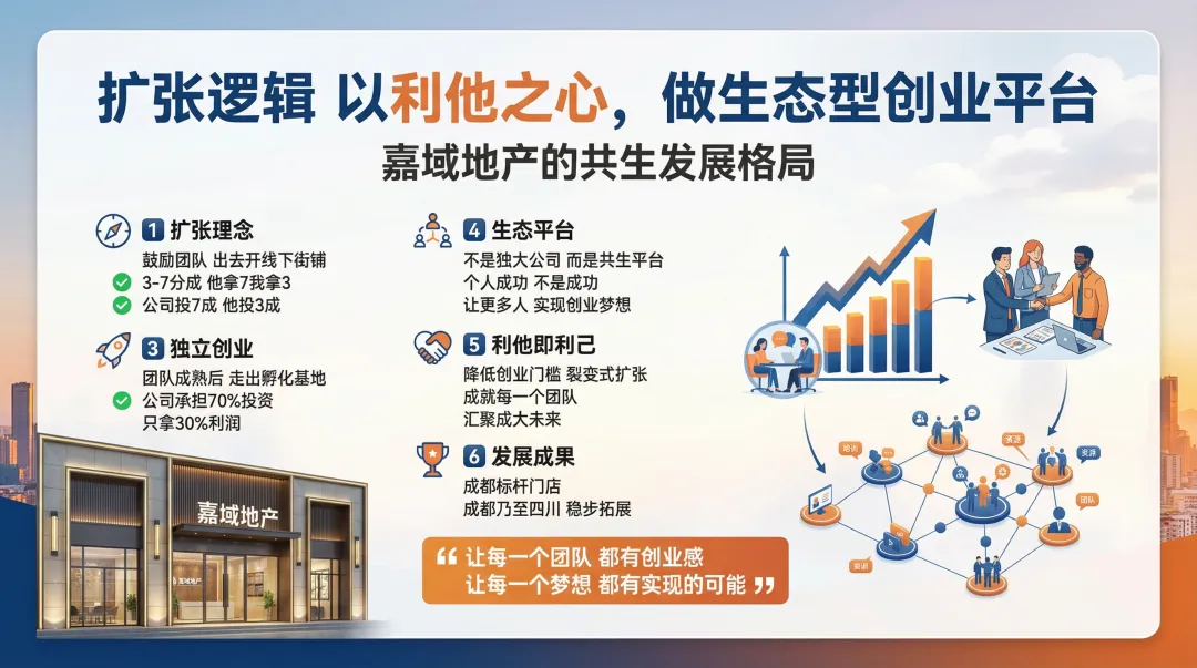 这不是 “慈善”,而是最实在的 “利他即利己”。通过降低伙伴的创业门槛,嘉域地产实现了裂变式扩张;通过成就每一个小团队的梦想,汇聚成嘉域的大未来。如今,嘉域旗下两家贝壳德佑门店已是成都标杆,而随着更多孵化团队的外溢,嘉域的版图,正在成都乃至四川稳步拓展。