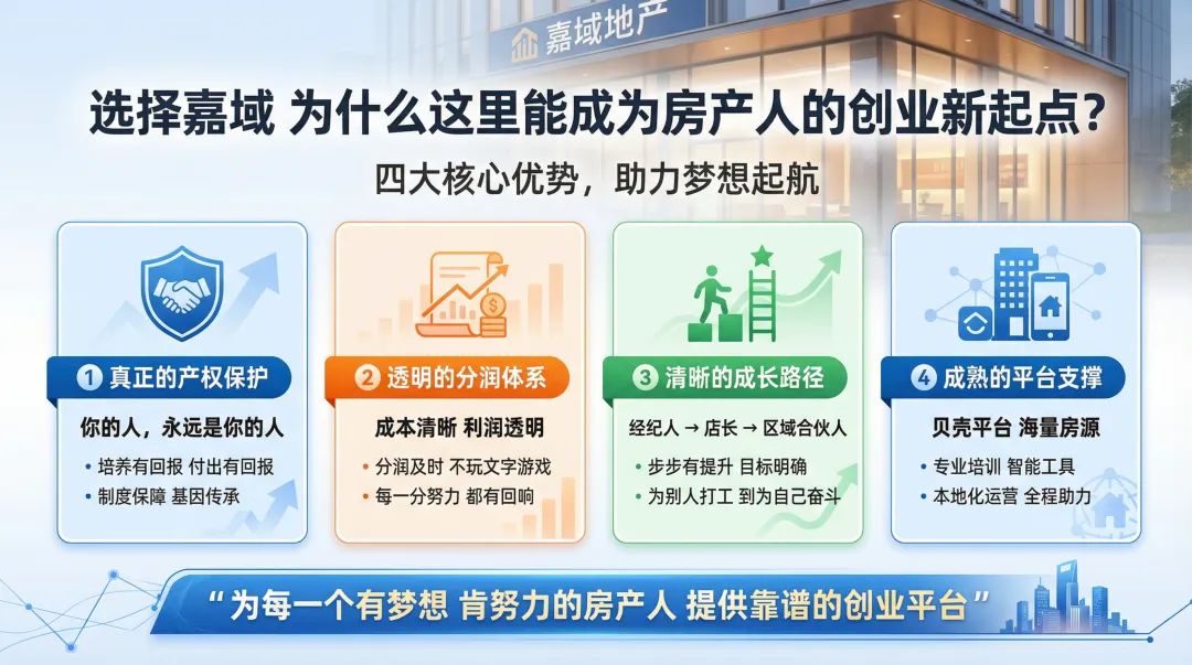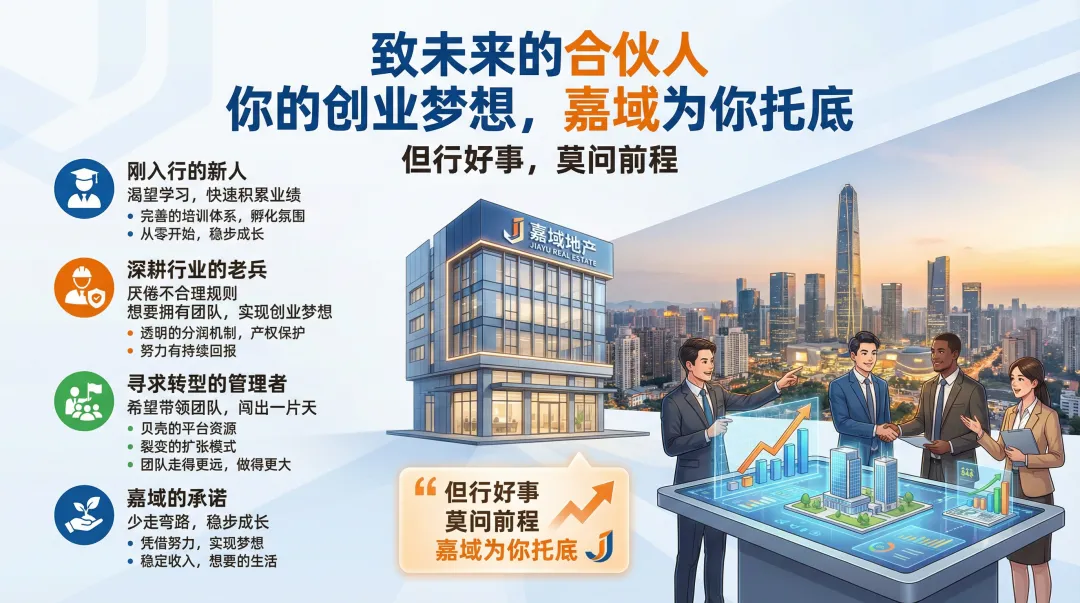 如果你是刚入行的房产新人,渴望学到专业知识、快速积累业绩,嘉域有完善的培训体系和孵化氛围,让你从零开始,稳步成长;如果你是深耕行业的老兵,厌倦了传统公司的不合理规则,想要拥有自己的团队、实现创业梦想,嘉域有透明的分润机制和产权保护,让你的努力有持续的回报;如果你是寻求转型的管理者,希望带领团队闯出一片天,嘉域有贝壳的平台资源和裂变的扩张模式,让你的团队能走得更远、做得更大。