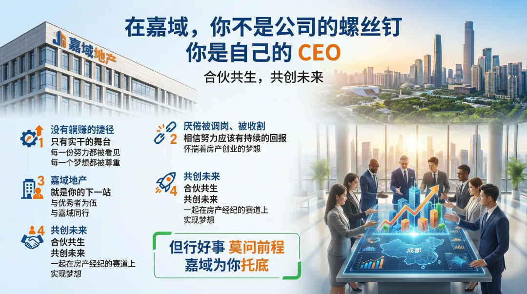 如果你厌倦了被调岗、被收割,如果你相信努力应该有持续的回报,如果你怀揣着房产创业的梦想,那么,嘉域地产,就是你的下一站。