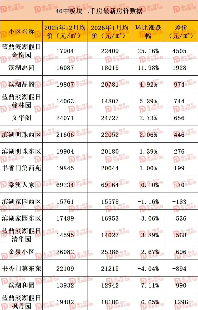 涨幅最高的蓝鼎滨湖假日金榈园,涨了4505元/㎡。