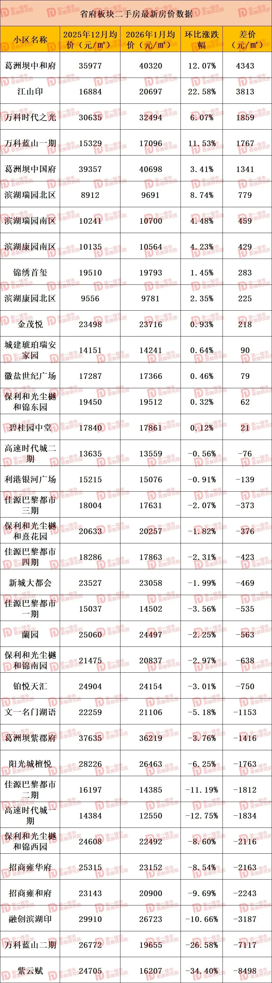 涨幅最高的是葛洲坝中和府,涨了4343元/㎡。