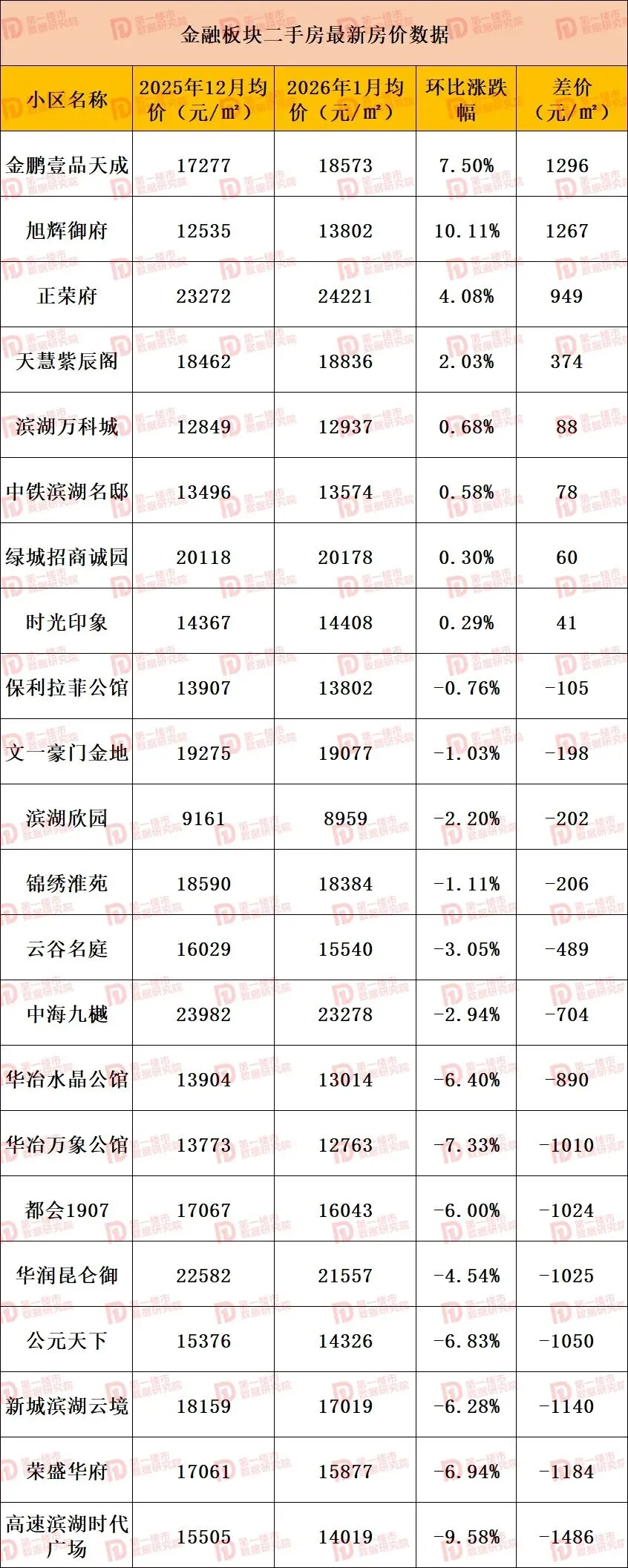 涨幅最高的是金鹏壹品天成,涨了1296元/㎡。