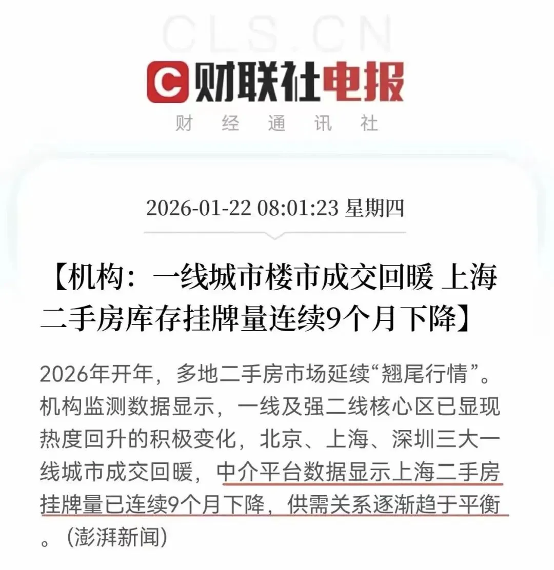 2026年开年,北京、上海、深圳三大一线城市楼市率先迎来暖意,二手房市场成为回暖核心引擎,其中上海表现尤为突出——二手房库存挂牌量实现连续9个月下降,当前库存较2025年1月降幅约20%,供需关系逐步从失衡走向结构性平衡,价量呈现“止跌回升、冷热分化”的鲜明特征,市场信心进入修复。