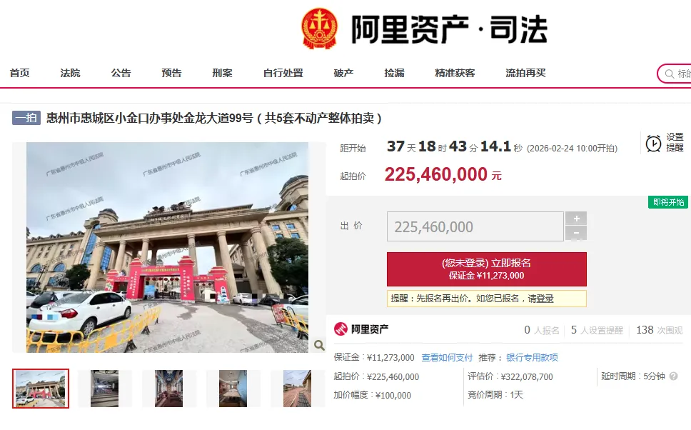 阿里资产网站显示,惠州市惠城区小金口办事处金龙大道99号(共5套不动产整体拍卖)共计65671.29平方米,起拍价为:225,460,000元,据竞拍公共显示:标的物原权属人惠州狮子城文化有限公司,本次拍卖标的物为上述5套不动产整体拍卖,狮子城文化创意园内还有两栋案外房产,不在本次处置范围内。上述不动产作为狮子城文化创意园正常营业中。据悉惠州狮子城文化创意园(原欧美城),拥有赛车文化、影视文化、演艺文化、婚博文化、研学教育、动物科普等16个主题业态,是集"旅游观光、文化体验、研学教育、休闲娱乐"功能为一体的多元化新型文化创意园区。