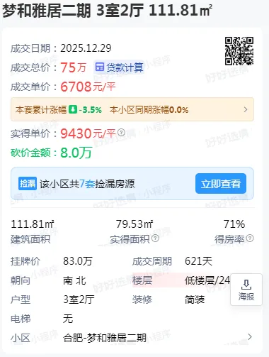 梦和雅居二期 111平户型,成交总价75万元,成交单价6708元/㎡。