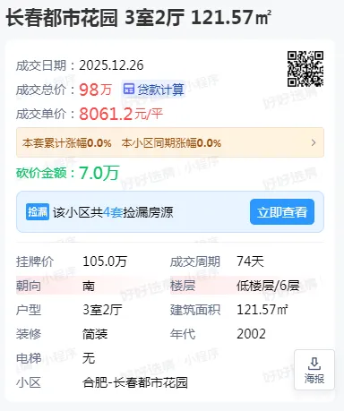长春都市花园 121平户型,成交总价98万元,成交单价8061.2元/㎡。