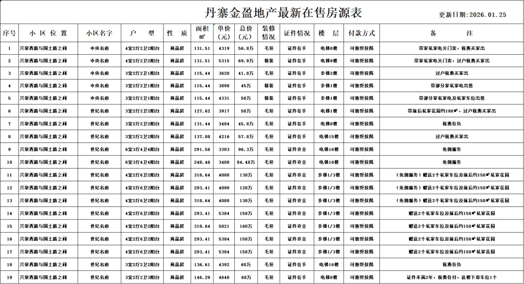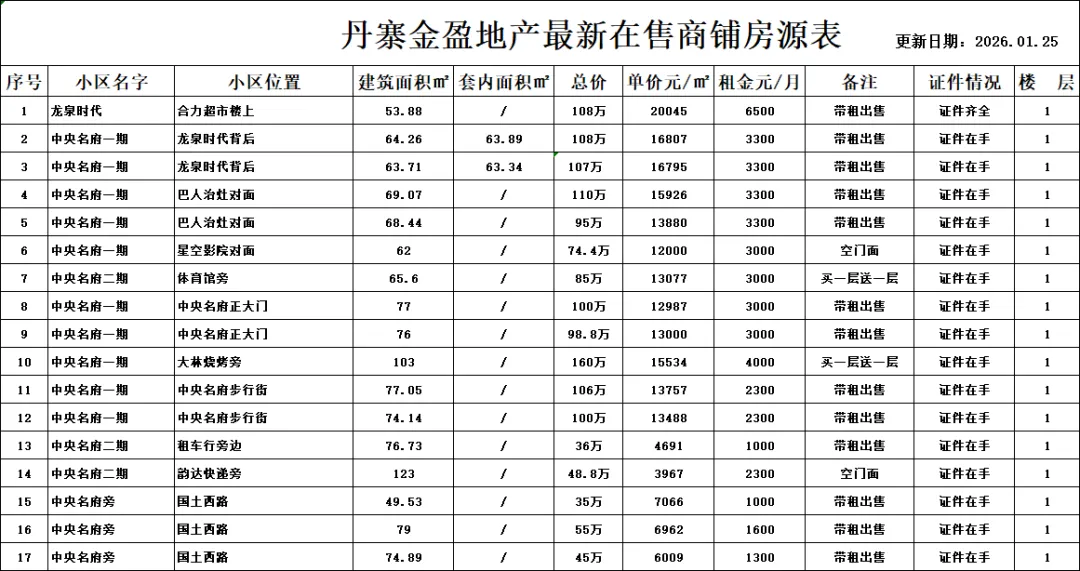>金盈地产最新在售房源表已更新,包含精装住宅,毛坯住宅,商铺,车位等销售及出租.百分百真房源,所售房源均证件在手,可按揭,随时看房
