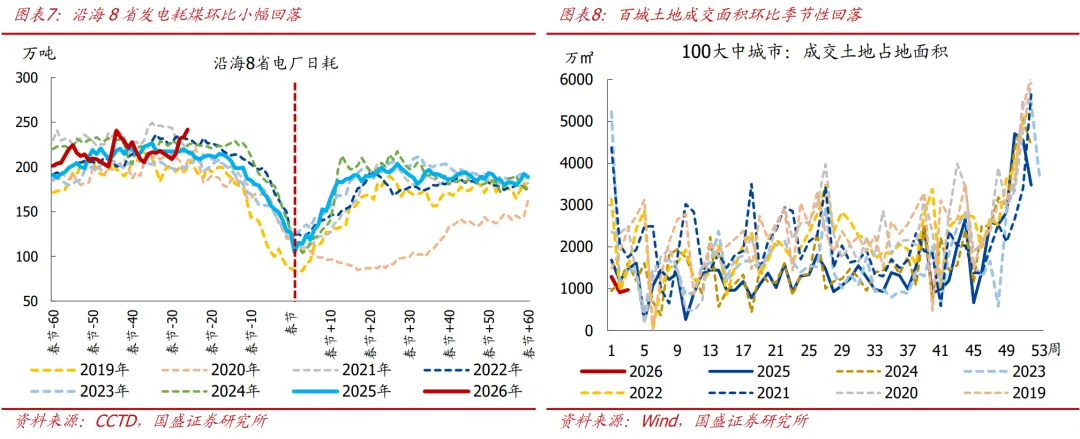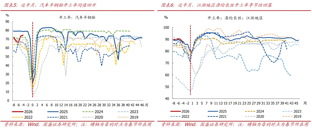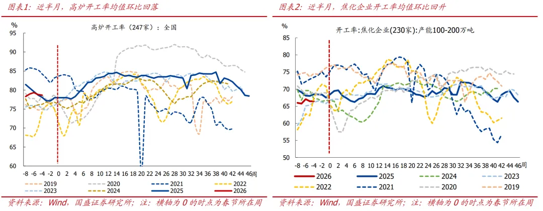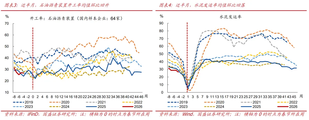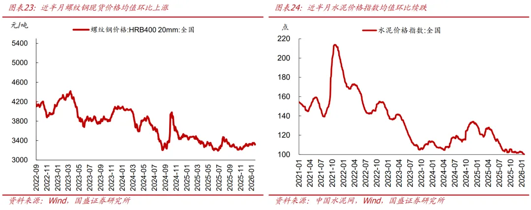 上游看,焦化、沥青开工率小幅回升,高炉开工率、水泥发运率回落。近半月来(春节前4-5周,对应阳历2026年1月12日-2026年1月25日),全国247家样本高炉开工率均值环比回落0.4个百分点至78.7%,弱于季节规律(2019-2025年同期均值为回升0.2%),相比2025年、2019年同期分别偏高0.4、3.8个百分点。焦化企业开工率均值环比回升0.04个百分点至66.5%,弱于季节规律(2019-2025年同期均值为回升1.1%),相比2025年同期偏低1.8个百分点,相比2019年同期偏高6.6个百分点。石油沥青装置开工率均值环比回升0.6个百分点至27.0%,相比2025年同期偏高2.0个百分点,相比2019年同期偏低9.5个百分点。水泥发运率均值环比回落1.1个百分点至27.6%,强于季节规律(2019-2025年同期均值为-3.9%),相比2025年、2019年同期分别偏低2.4、17.5个百分点。