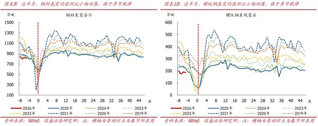钢材、螺纹钢表需环比小幅回落、强于季节规律。近半月,钢材表需均值环比回落0.2%至817.8万吨,强于季节规律(2019-2025年同期环比均值为-6.1%),相比2025年、2019年同期分别偏低5.1%、12.6%。其中:螺纹钢表需均值环比回落0.1%至187.9万吨,强于季节规律(2019-2025年同期环比均值为-8.2%),相比2025年、2019年同期分别偏低18.0%、38.6%。