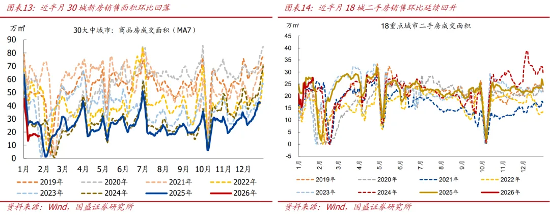 核心结论:近半月高频变化有三:一是开年以来二手房销售改善,环比强于季节性,同比降幅收窄至7.3%(2025年12月同比降26.5%);新房销售则继续走弱,环比弱于季节性,同比降38.6%(2025年12月同比降26.6%);二是主要大宗商品价格延续上涨,布伦特原油、焦煤、铜价格环比分别上涨5.4%、3.4%、2.1%;三是汽车零售继续走弱,反映消费内生动能仍偏弱。
