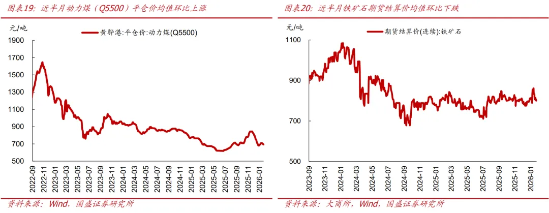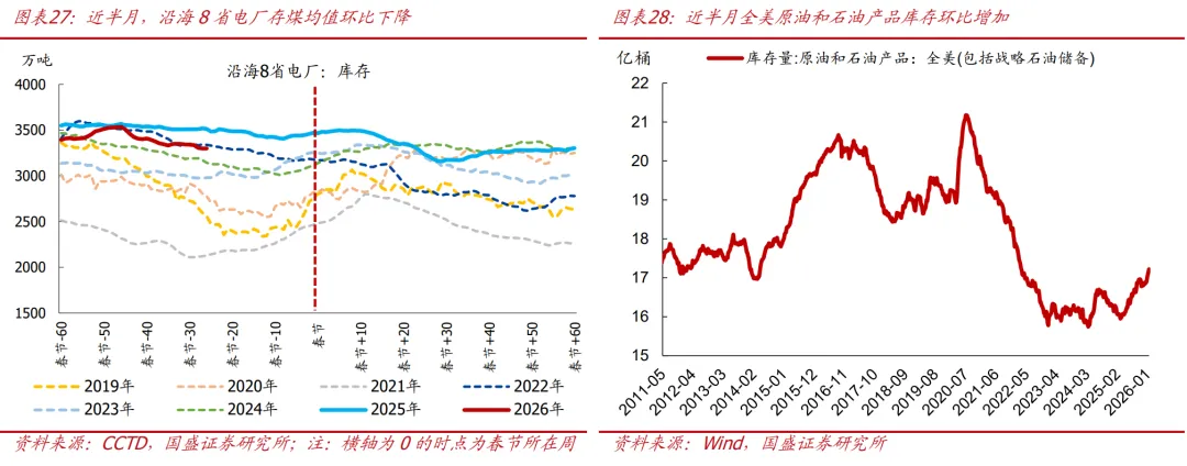 沿海8省电厂存煤下降,全美原油及石油产品库存增加。近半月来,沿海8省电厂存煤均值环比下降3.7%,同比下降5.1%、相比2019年同期偏高19.8%。截至2026年1月16日,全美原油及石油产品库存环比增加1476.8万桶,绝对值为17.2亿桶。