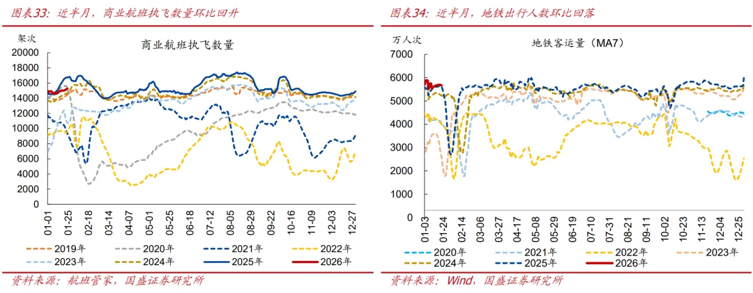 >人员流动:近半月,商业航班执飞数量均值环比回升2.6%,相比2025年同期偏低7.5%;10个重点城市地铁客运人数环比回落1.4%,绝对值为近年同期最高,相比2025年偏高1.1%。