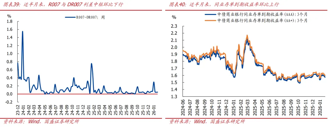 >货币市场流动性:为对冲税期+信贷投放+春节取现需求带来的资金缺口,近半月央行通过OMO实现净投放10423亿元,通过6个月买断式逆回购实现货币净投放3000亿元;通过MLF实现货币净投放7000亿元。近半月资金面偏宽松,货币市场利率多数下行,DR007、R007和Shibor(1周)中枢环比分别下行4.7bp、12.2bp、2.7bp,绝对值均高于7天逆回购利率。R007、DR007利差下降12.9个百分点,不同机构间流动性分层现象不明显。同业存单到期收益率中枢环比上行,3月期AAA、AA+同业存单到期收益率环比均上行1.2bp。