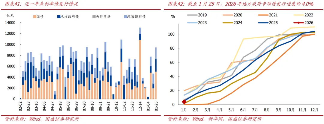 一级市场:近半月来,利率债合计发行13856.6亿元,环比上期多发5964.3亿元。具体看:国债发行7220.0亿元,环比多发2270.0亿元。地方政府债发行3064.1亿元,环比多发1627.5亿元,其中:地方专项债发行871.8亿元;年初以来累计发行1746.1亿元,如果按照2025年44000亿元的额度计算,发行进度4.0%,慢于2025年同期。政策性银行债发行3572.5亿元,环比多发2066.8亿元。
