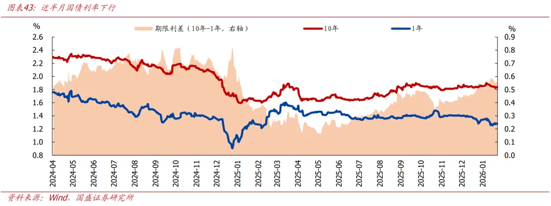 >债券市场流动性:近半月,利率债合计发行13856.6亿元,环比上期多发5964.3亿元。具体看:国债发行7220.0亿元,环比多发2270.0亿元。地方政府债发行3064.1亿元,环比多发1627.5亿元,其中:地方专项债发行871.8亿元;年初以来累计发行1746.1亿元,如果按照2025年44000亿元的额度计算,发行进度4.0%,慢于2025年同期。政策性银行债发行3572.5亿元,环比多发2066.8亿元。近半月,国债利率下行,10Y国债到期收益率中枢环比下行2.1bp,1Y国债到期收益率中枢环比下行5.8bp,分别收于1.834%、1.277%。