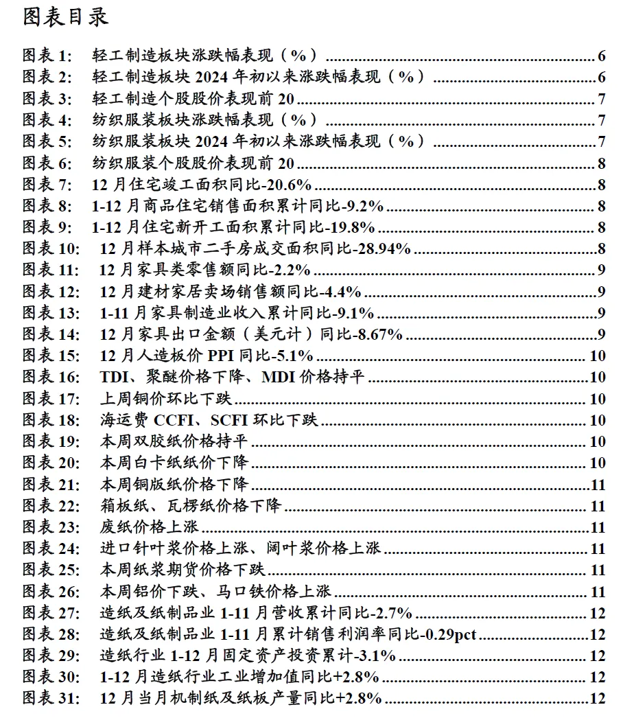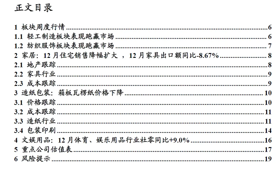 宏观经济环境波动风险:轻工板块受国内外经济环境影响较大,出口型企业外销占比较高、对全球经济环境依赖度较高,内销型企业需求受国内经济复苏进程影响大,若国内外经济环境出现大幅波动,轻工板块企业收入及利润或将受到较大影响,提示宏观经济环境波动风险。原材料成本大幅上涨风险:原材料成本对多个板块内公司的盈利能力影响较大,若出现原材料价格大幅上涨的情况,企业盈利能力或将受到较大影响,提示原材料成本大幅提升的风险。*法律声明及风险提示