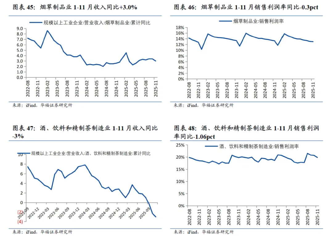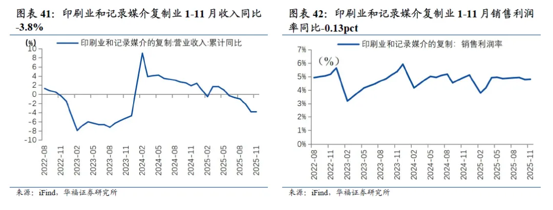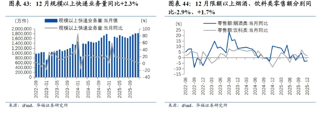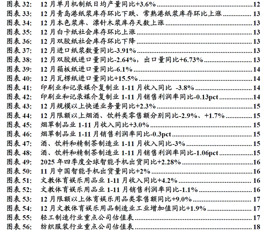 1-11月印刷业收入同比下降、利润率同比下降。从工业企业规模以上制造业效益来看,印刷业和记录媒介的复制业1-11月营业收入累计同比-3.8%,增速环比1-10月持平;1-11月累计销售利润率4.8%,同比-0.13pct,环比+0.02pct。需求方面,12月规模以上快递业务量同比+2.3%,12月烟酒零售额同比下滑,饮料零售额同比增长。12月规模以上快递业务量182.1亿件,同比+2.3%,增速环比11月-2.7pct。12月限额以上烟酒类企业零售额当月同比-2.9%,增速环比11月+0.5pct;限额以上饮料类企业零售额12月当月同比+1.7%,增速环比11月-1.2pct。1-11月烟草制品业收入同比增长、酒饮料精制茶制造业收入同比下滑。烟草制品业1-11月营业收入累计同比+3%,增速环比1-10月-0.4pct;1-11月累计销售利润率13.0%,同比-0.28pct。酒、饮料和精制茶制造业1-11月收入累计同比-3%,增速环比1-10月-0.7pct;1-11月销售利润率19.8%,同比-1.06pct。
