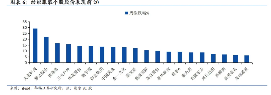 截止2026年1月23日过去一周,纺织服装板块中,天创时尚、梦洁股份、探路者、三夫户外、华茂股份分别上涨29.16%、22.03%、16.55%、15.63%、14.44%,表现优于其他个股。