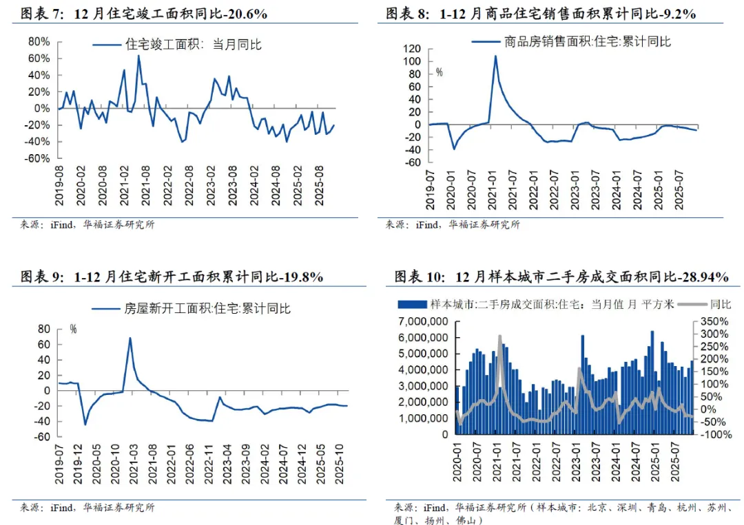 地产方面,住宅竣工面积12月同比-20.6%,增速环比11月+7.36pct。全国商品住宅销售面积1-12月累计同比-9.2%,环比1-11月增速-1.1pct。住宅新开工面积1-12月累计同比-19.8%,环比1-11月增速+0.1pct。样本城市二手房住宅成交面积12月同比-28.94%,相比11月增速-4.19pct。