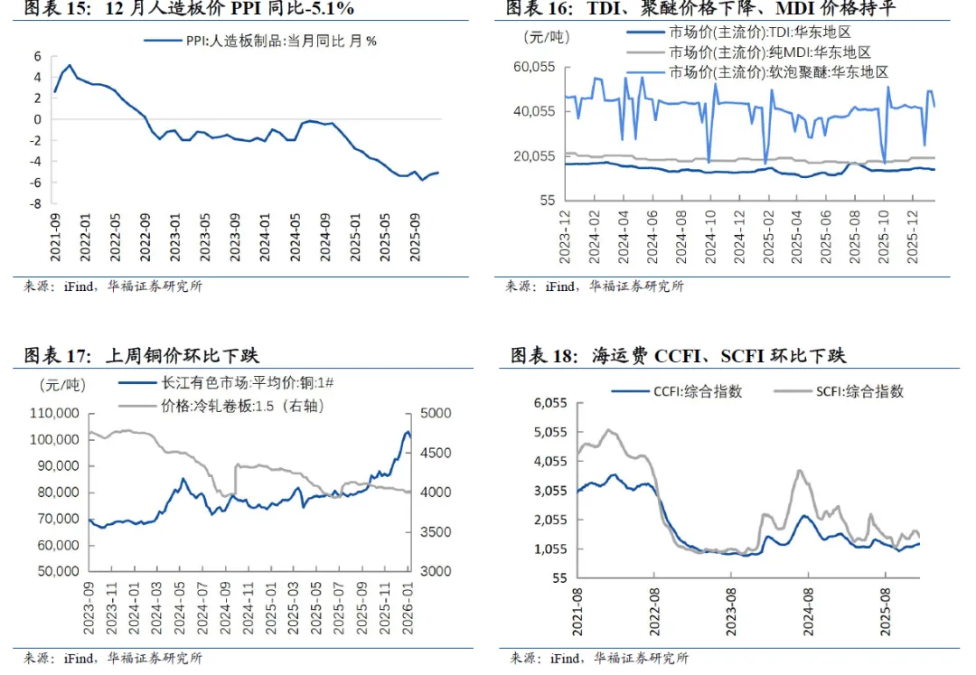 人造板方面,12月人造板制品PPI同比-5.1%。截至2026年1月23日,化工原料方面,TDI、MDI、聚醚市场价格环比分别-1.1%、+0%、-1.3%;五金原料铜价环比-2.1%;截止1月23日,海运费CCFI、SCFI综合指数环比-0.1%、-7.4%。