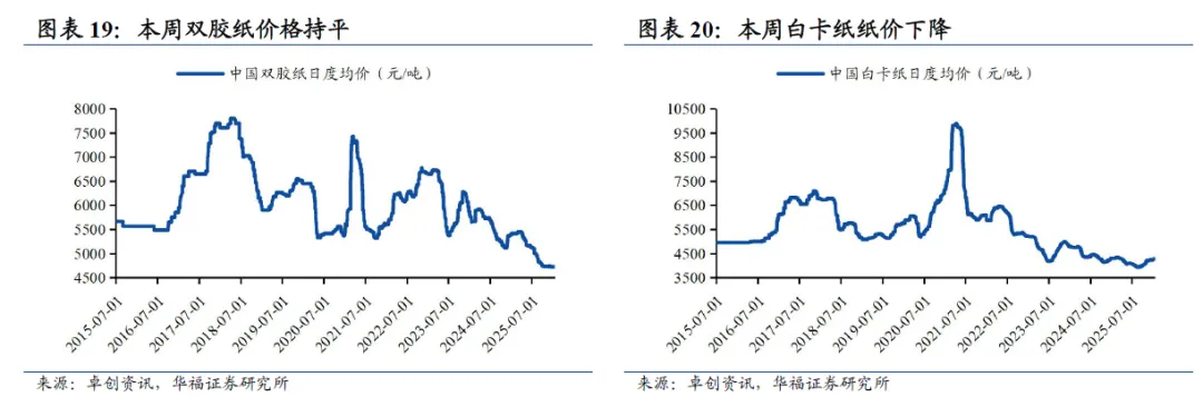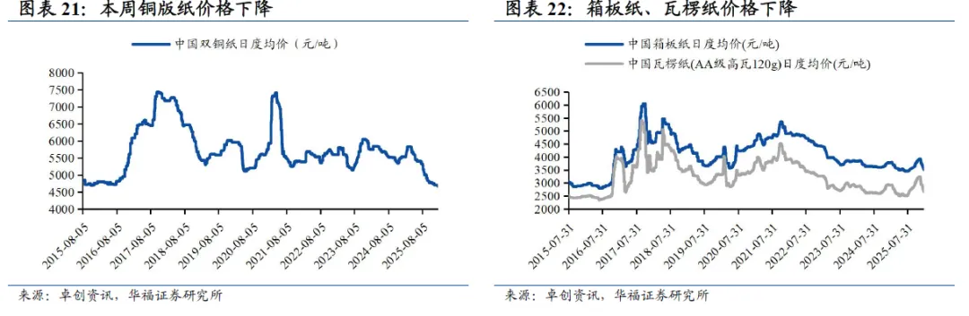 纸价方面,箱板瓦楞纸价格下降。根据卓创资讯,截至2026年1月23日,双胶纸价格4725元/吨(持平),铜版纸价格4660元/吨(-20元/吨);白卡纸价格4269元/吨(-5元/吨);箱板纸价格3519.2元/吨(-52.8元/吨),瓦楞纸价格2669.38元/吨(-55.62元/吨)。