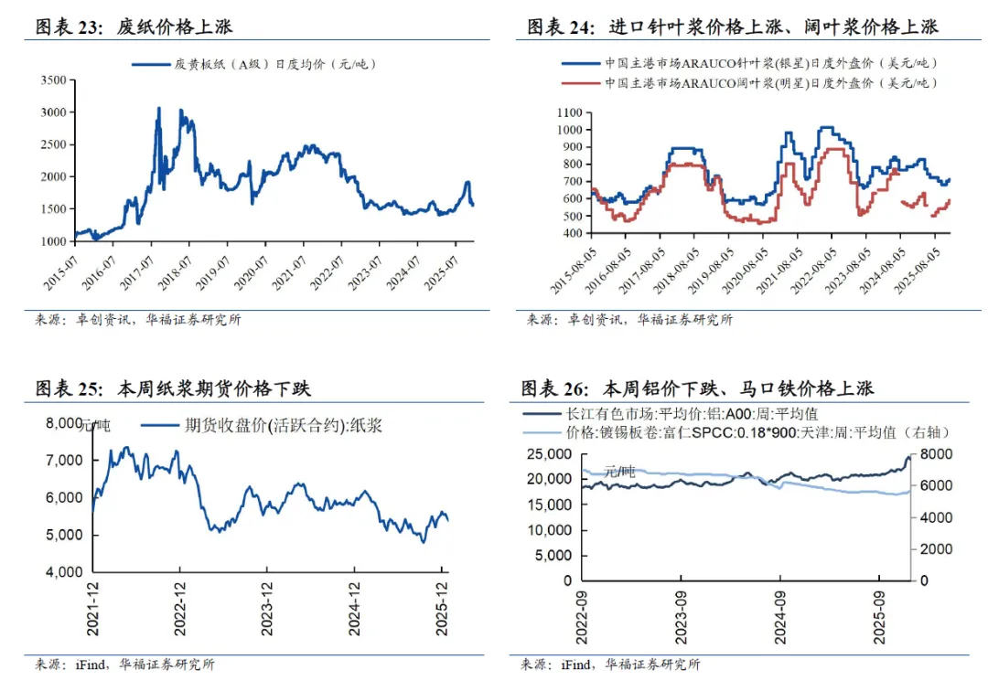 成本方面,截至2026年1月23日过去一周,废纸价格上涨。截至2026年1月23日,中国废黄板纸(A级)日度均价为1575元/吨(+14元/吨)。截至2026年1月23日,A00铝价格23816元/吨(-486元/吨),镀锡卷天津富仁价格5650元/吨(+80元/吨)。截至2026年1月23日,纸浆期货价格为5375.2元/吨(-79.6元/吨)。截至2026年1月22日,智利明星阔叶浆590美元/吨,银星针叶浆价格为710美元/吨。