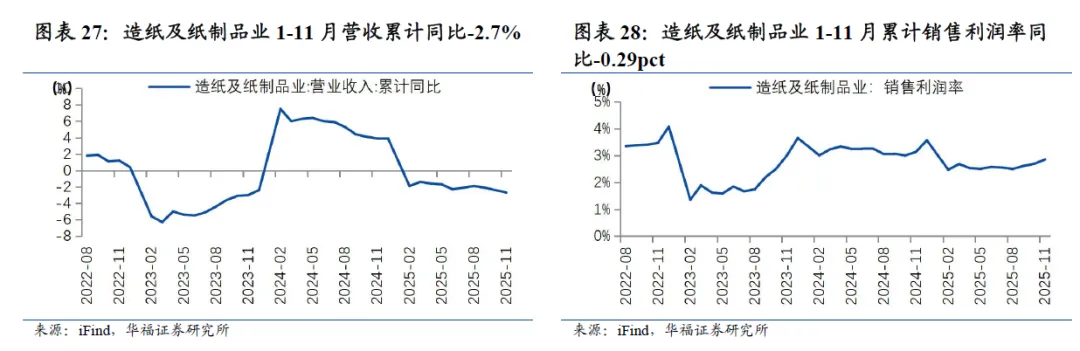 1-11月造纸行业营收、利润率同比下滑。从工业企业规模以上制造业效益来看,造纸及纸制品业1-11月营业收入累计同比-2.7%,增速较1-10月-0.3pct;1-11月累计销售利润率2.9%,同比-0.29pct,环比+0.16pct。